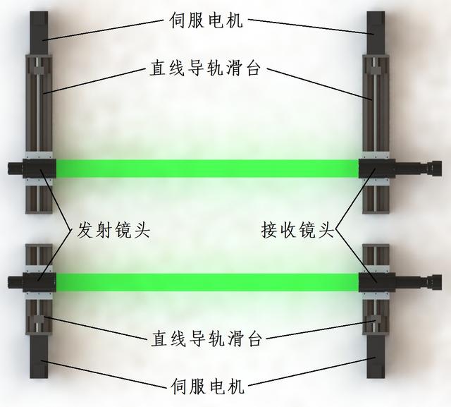 测径仪测量的钢管外径范围很大,所以采用间距可调式测头布置形式。上、下两组测头的发射镜头和接收镜头均安装在直线导轨滑台的滑块上(如图2所示)。安装下方测头的直线导轨滑台行程较小,其作用是调整由于不同直径钢管在托辊上支撑时钢管下沿的高度差异;安装上方测头的直线导轨滑台行程较大,主要是根据钢管规格调整两组测头的间距。直线导轨滑台均采用伺服电机驱动,可以调整上方测头与下方测头的间距。间距调整的原则是将两组测头的中心距调整至钢管外径的标称尺寸。因此钢管在旋转过程中如有偏心旋转或摆动,只要摆动范围不超过30mm均能正常测量。