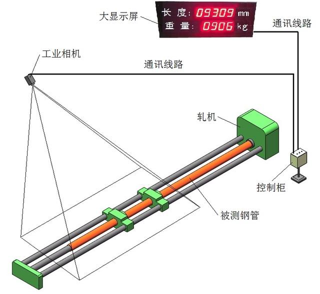 一个工业相机进行拍摄,采用对工业相机拍摄的可视化图像进行图像处理的方法测量。当钢管的端面处于相机视野之内时,工业相机拍摄图像。通过两个边界之间包含的像素数量即可计算出钢管的长度尺寸。