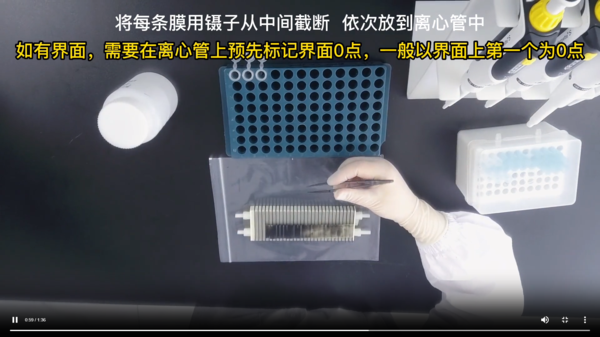 将底层固定膜整齐平铺于一组陶瓷排刀上 示例为画5mm的分辨率,如果DGT膜有界面需先确定界面位置再切膜,此示例无界面如有泥水界面,需将界面缺口处对准刀口以保证界面完整性再进行下步操作,取干净的自封袋复在固定膜表面(注:按压时注意刀口锋利,可重复多次按压以免伤到手指),一只手固定住自封袋一端 另一只手用指腹轻轻按压固定膜切断成条状,全部按压完毕 从一端轻轻掀起自封袋 切记不要将膜移位。5mm的分辨率对应的是加入800ul的提取液,摇晃离心管 确保每条膜都地浸没在提取液中