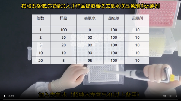 扫描并读取空白板的的吸光值,测标样,标样试剂配比具体看操作,可手动振荡几下 将部分挂壁溶液充分混合。待测元素为Fe,故恒温震荡35分钟,震荡完毕放入微孔板分光光度计,读取标液吸光值,减去空白板的吸光值后即可得到每个标液浓度的吸光值,代入公式计算。
