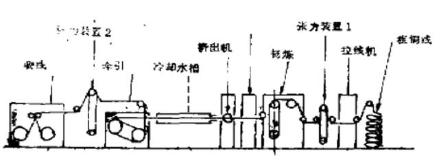 绝缘线芯是在流水线上生产上进行,预拉成1.6mm的铜线1由中拉机拉成0.4~0.9mm铜线,经过韧炼装置4韧炼,预热器5加热到一定温度由挤出机6挤包泡沫聚乙烯,再经冷却水槽7冷却后由牵引轮8定速牵引并收入收线装置的线盘内。