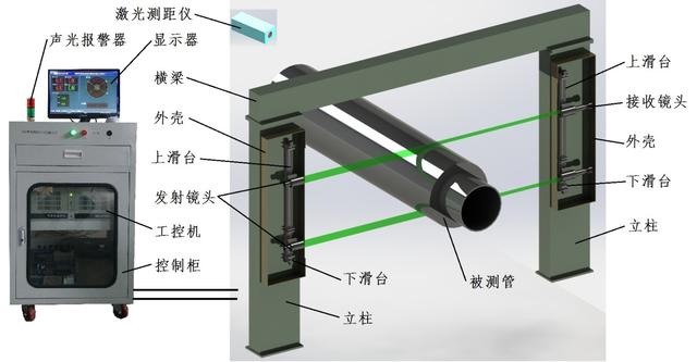大直径测径仪系统主要包括:测径仪、激光测距仪、控制柜、工控机、显示器、声光报警器、计算机+软件(图中未显示)、PLC系统(图中未显示)等组成,系统组成及测径仪整体结构如下图所示。
