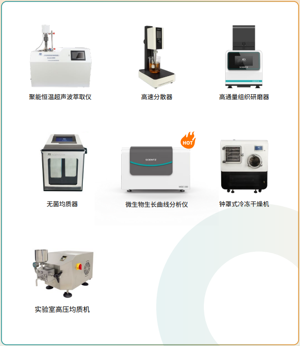 新芝生物可为食品科学领域提供相关解决方案,应用范围涵盖了从食品样品前处理中进行细胞破碎、萃取、分散,到食品检测中对食品的各种成分分析,如营养成分、添加剂、农药残留、重金属等成分,再到食品安全监控环节中可监控和预警,如微生物污染检测、致病菌检测等,还涵盖了食品工艺研发过程中会遇到的发酵、配方优化等环节,皆可闭眼入手新芝生物强烈推荐的解决方案!