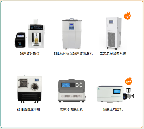 新芝生物可提供“微球制备-微球分散-产品干燥”的配套设备。以超声分散、冷冻干燥为核心竞争力,实现纳米微球高效、可控制备及均匀分散等要求。同时,新芝生物具备相关配套清洗、恒温等仪器,可配套服务实验室相关清洗和温控需要,用于配套服务相关分析仪器的样品制备及温度控制。