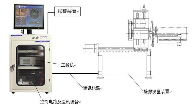 气缸套壁厚测量装置的整套设备包括:壁厚测量装置、主控机柜(内装控制电路、通讯设备和工控机)、显示设备(液晶显示器)、声光报警装置等。设备组成及主控机柜、壁厚测量装置的结构样式见下图。