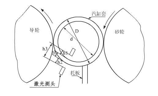 虽然无心磨床加工时工件没有使用夹具固定,但是在靠近底部托板处,工件的位置相对来说变化不大。在此处缸套内外相对布置两只高精激光测头。上下两只激光测头分别测从到汽缸套内外壁的距离h1和h2,并且通过夹具将两个传感器之间的距离间定在h3,从而汽缸套在测量点的厚度H=h3-h1-h2。