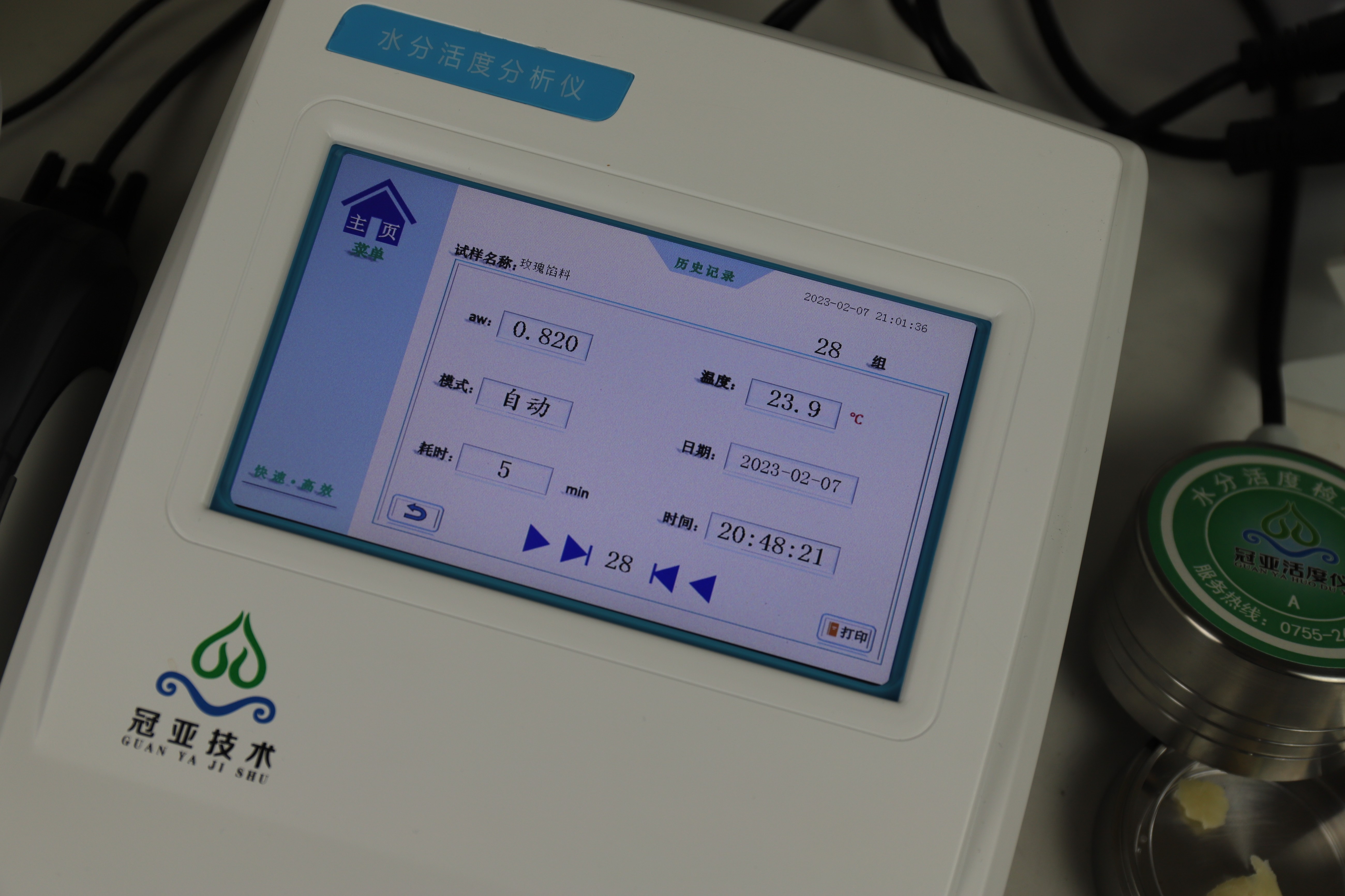 食品的变质与食品中的水分含量有关,虽然变质程度并不与水分含量成比例,但水分活度的大小更能说明食品发生变质的问题。水分活度决定了各种微生物在食品中萌发的时间、生长速率和死亡率。水分活度越大,食品内自由水含量越多,越易受微生物感染;而食品中水分活度越小,食品越稳定,较少出现变质的问题。因此,水分活度成为一个指示产品稳定性和微生物安全的重要参数。另外,由于各种微生物的生命活动以及各种化学、生物化学变化都需要一定的水分活度值,所以水分活度值对食品保存具有重要的意义。水分活度、水活性、水活度均属于同一概念。目前市场上受欢迎的水分活度仪冠亚牌GYW-1,操作简单,广泛应用于食品企业、院校、科研单位等。