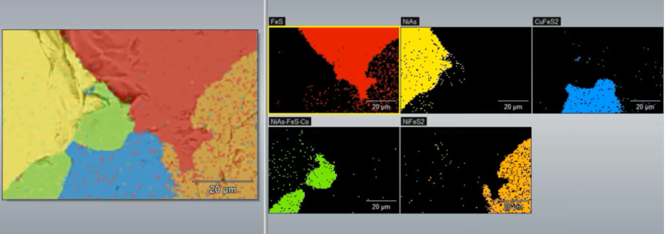 在使用能谱检测样品的同时,可显示出不同相在样品中的分布情况,使得物相分布直观可见,同时具有相归类,计算相比例等功能,非常适用于合金、陶瓷、矿物分析等领域的测试分析。