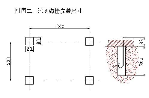 ◆支座:支座是由磨机(9)及电动机(12)组成的钢结构,用以支承罩壳,磨机,电动减速机及电器控制箱等,磨机座底部有4 个Φ20底脚螺栓孔,用以固定全套设备。(地脚安装尺寸见图二)。