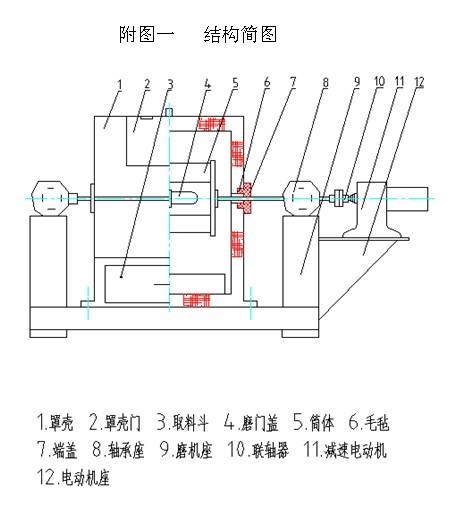 本试验磨它是由支座、电器控制箱、罩壳、磨机等四部分组成。