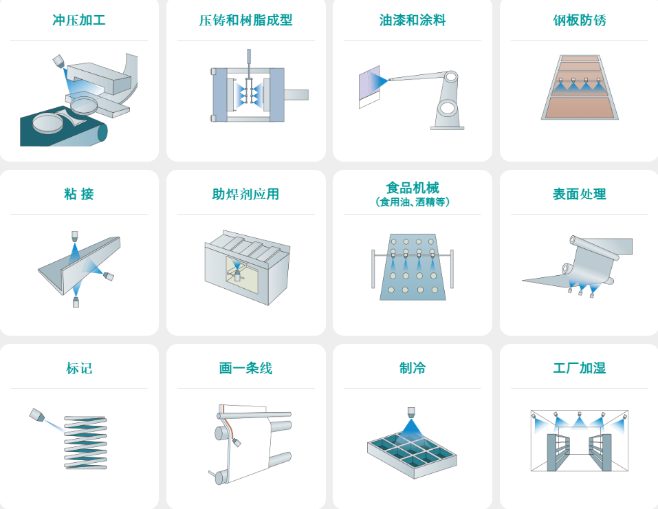 当然,应用不仅限于加工油。我们在各种工业领域的液体点胶方面拥有丰富的经验,包括脱模剂、半导体安装助焊剂、粘合剂应用、标记、加湿以及酒精和增味剂。如果您想稀薄而均匀地涂抹液体,这就是Lumina的用武之地。