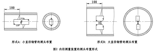 由于受激光测头的外形尺寸和量程范围的限制,小规格钢管和大规格钢管的测头形式不太相同。小规格钢管的两个测头需要重叠放置才能伸入钢管内,大规格钢管可以将测头正对布置。两种布置形式如图2所示。