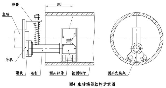 如图4所示,主轴端部装有导轨和滑块,滑块通过"连杆"和"测头安装架"与测头部件连接固定。连杆与主轴成偏心结构,当测头伸入钢管后在弹簧的作用下测头安装架下部的小轮与钢管内壁贴紧。测头安装架下部的小轮以测头激光束为中心严格对称,以保证激光束通过钢管的中心,使测量值为钢管的真实内径。当主轴旋转时,通过连杆带动测头安装架沿钢管内壁旋转,即可测得钢管在圆周上的多个内径(通过测量频率和主轴转速的控制,可以使测得的直径数量达到500个以上)。