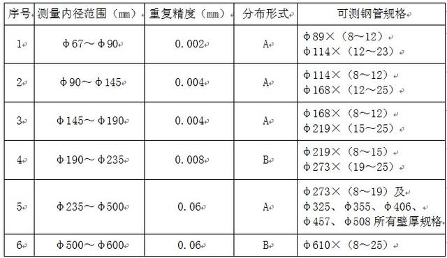 根据钢管的规格、壁厚和测头的量程范围,内径测量仪由以下几种规格的测头(可定制):