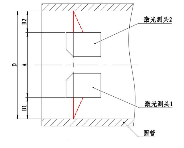 图中激光测头1和激光测头2以固定间距A背向布置,且测头发射的激光处于圆管的直径线上。工作时激光测头1发射一束激光照射圆管下方的内壁,圆管内壁的漫反射光再返回到激光测头1内的C-MOS芯片上,通过对C-MOS芯片上光斑的位置分析和计算,可以得到激光测头1到圆管下方内壁的实际距离B1;同理可以得到激光测头2到观摩上方内壁的距离B2。两个测头的间距A加上两个测头到被测物上下表面的距离B1、B2即可得到圆管的内径尺寸D。