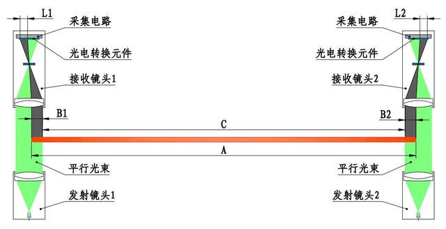 图中2个发射镜头内设置有LED点光源,点光源发出的光通过透镜变成平行光束分别射向2个接收镜头。通过接收镜头内的透镜使平行光束在光电转换元件CCD芯片上成像当被测物通过2束平行光构成的视场时,在光电转换元件的像上就会出现虚拟的阴影,设其宽度分别为L1、L2。经过对光电转换元件发出的电信号处理和计算可以得出L1、L2所对应的尺寸B1、B2,B1加B2再加上两个镜头之间的净间距C即可得出被测物的宽度尺寸A。