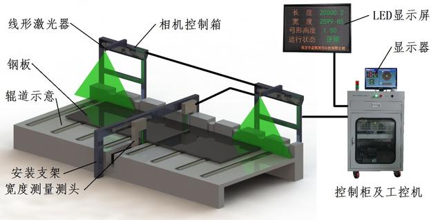 整套设备测长单元、测宽单元和控制柜等几大部分。具体有:相机控制箱(箱内装有工业相机和直线导轨滑台)2套、线形激光器2个、宽度测量测头2组、安装支架、控制柜、工控机、显示器和声光报警器等,设备的组成及整体结构见下图。