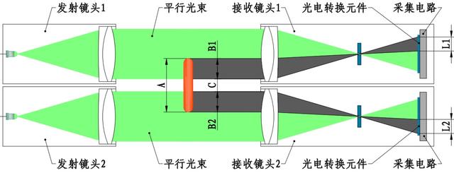 2个发射镜头内设置有LED点光源,点光源发出的光通过透镜变成平行光束分别射向2个接收镜头。通过接收镜头内的透镜使平行光束在光电转换元件CCD芯片上成像(注:一个发射镜头和一个接收镜头组成一组光电测头)。当被测物通过2束平行光构成的视场时,在光电转换元件的像上就会出现虚拟的阴影,设其宽度分别为L1、L2。经过对光电转换元件发出的电信号处理和计算可以得出L1、L2所对应的尺寸B1、B2,B1加B2再加上两个镜头之间的净间距C即可得出被测物的宽度尺寸A。