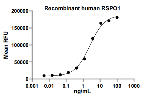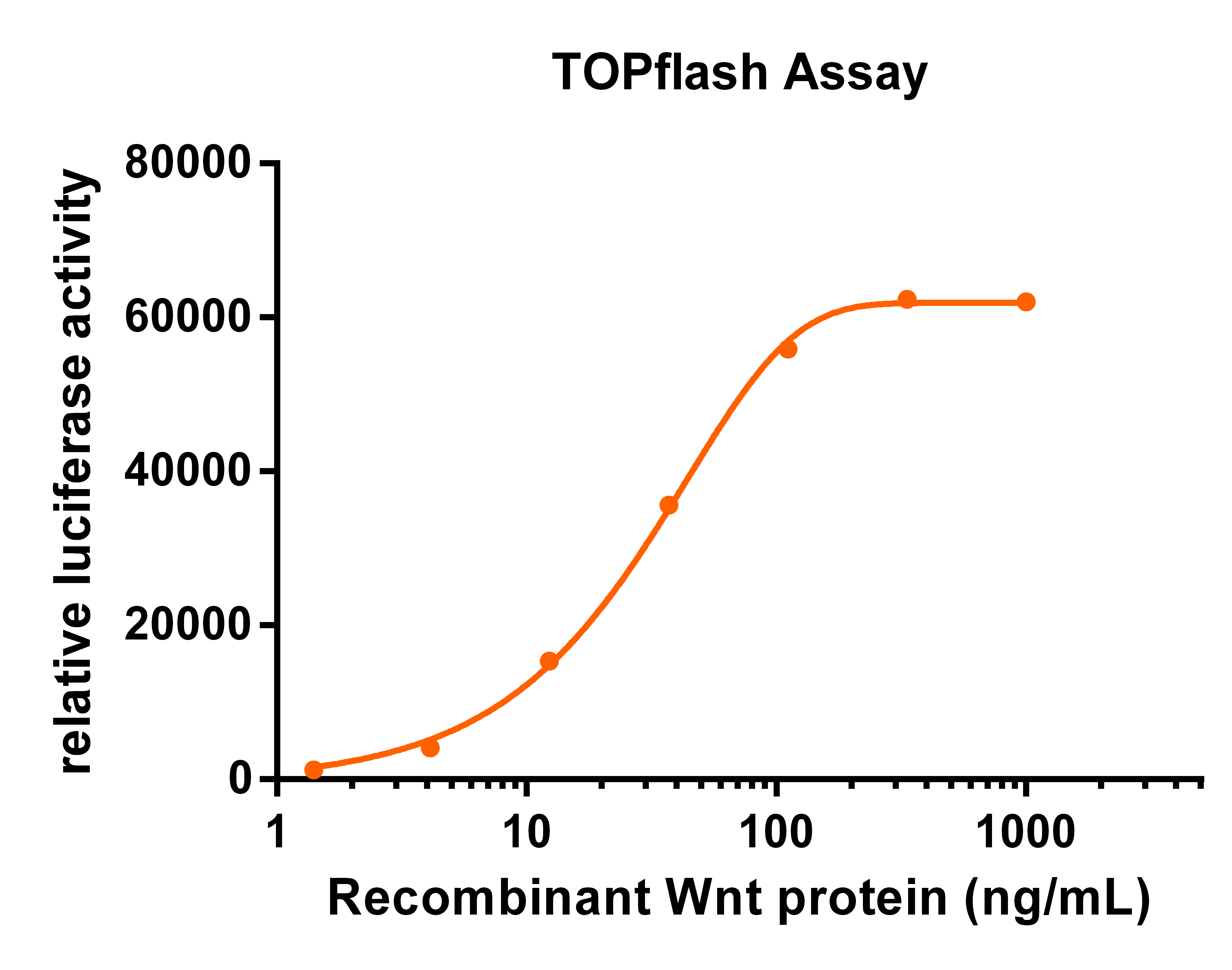 Figure2. Measured by its ability to induce Topflash reporter activity in HEK293T human embryonic kidney cells. The EC50 for this effect is 1.0 - 10.0 ng/mL in the presence of 5 ng/mL recombinant Wnt3a.