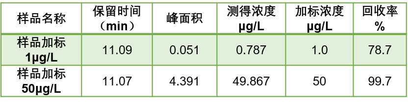按照“1.1”项色谱条件,连续注入样品加标2μg/L溶液和样品加标5μg/L溶液进样分析,测得样品加标图谱见图4和图5。样品加标测试数据见表4。