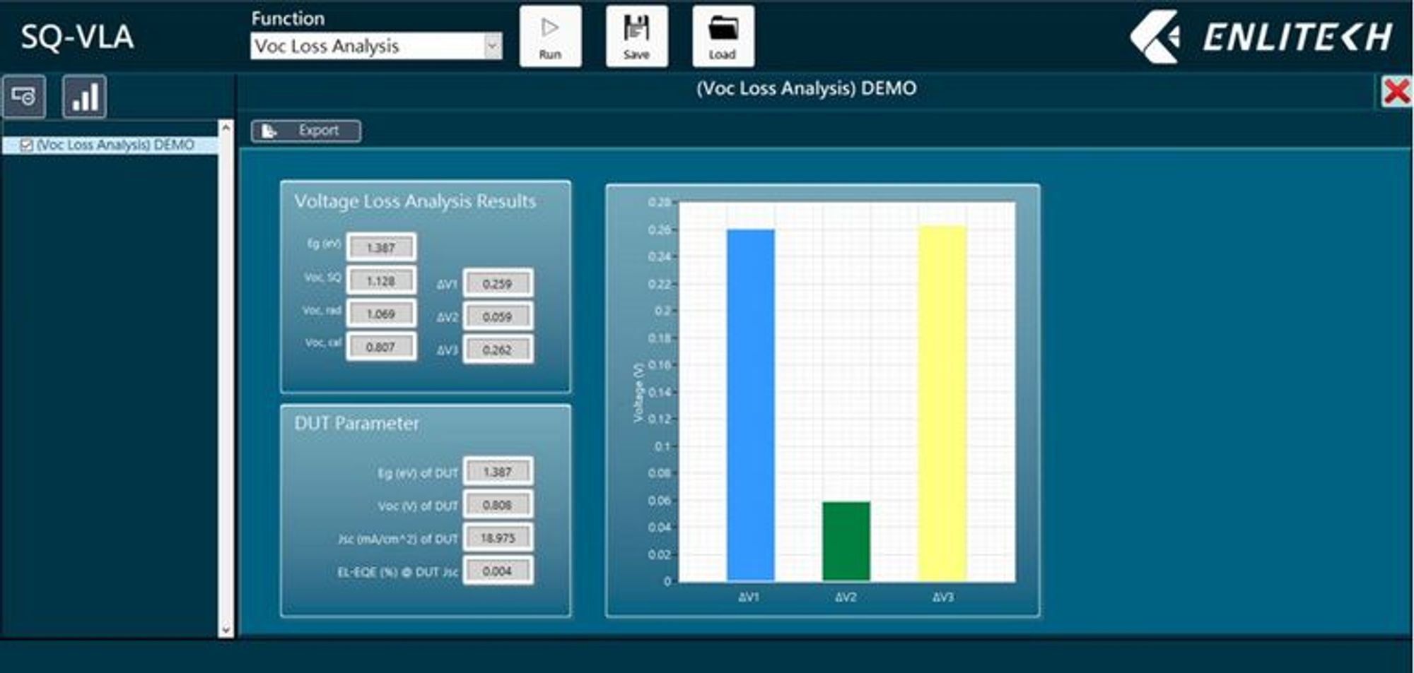 总体而言,SQ-VLA 软件的快照展示了一个综合平台,使研究人员能够加载实验数据并立即了解 Voc 损失,从而使他们能够评估并潜在地增强太阳能电池的性能。