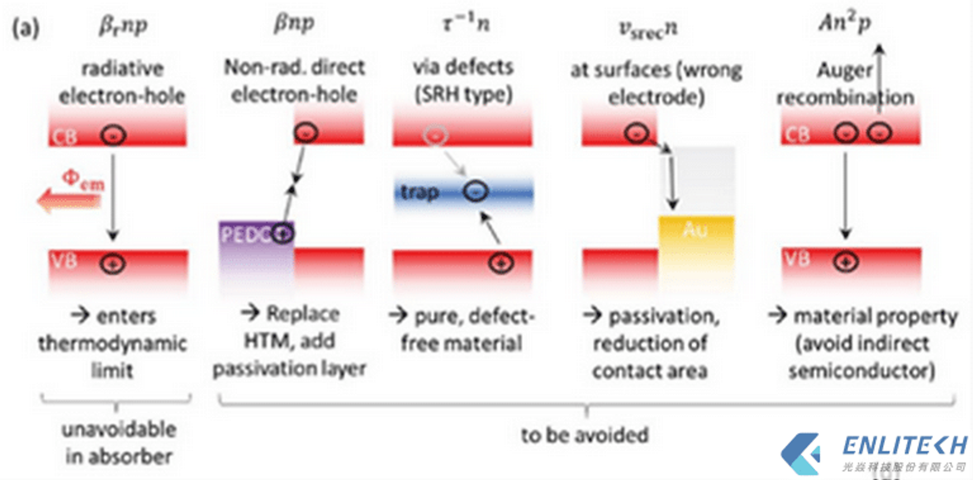 图 9 提供了太阳能电池中辐射和非辐射复合损失所涉及机制的说明性分解,2017 年发表的《先进能源材料》杂志对此进行了详细解释。