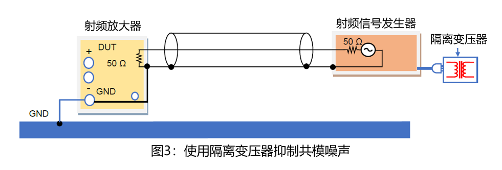 上述的噪声问题是由接地回路所引起的。为了解决这个问题,可如下图3所示,通过放置一个隔离变压器来断开接地回路。