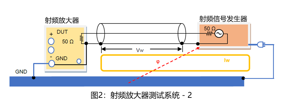 下图2显示了射频信号发生器输出连接器通过同轴电缆连接至射频放大器输入端口。在该系统中,接地回路显示明显,所以如果由共模噪声引起的外部磁通通过该回路,那么噪声电流(Iw)将会流经同轴电缆的外导体。因此产生了噪声电压(Vw)。Vw是通过射频放大器的输入端口被添加至射频信号发生器(RF SG)。射频同轴电缆在其中心导体处的总阻抗为100Ω。当外部磁通通过这个回路时,电流不会流经具有高阻抗的中心导体,所以噪声电流(Iw)只流经同轴电缆的外导体。这些不平衡的电流导致噪声电压加至了射频信号。