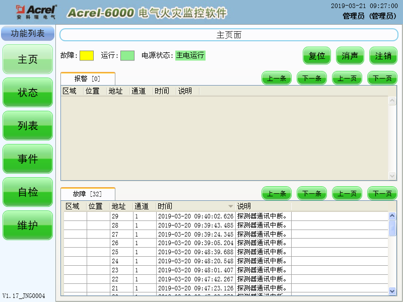 通讯故障报警:当监控设备与所接的任一台探测器之间发生通讯故障或探测器本身发生故障时,监控画面中相应的探测器显示故障提示,同时设备上的黄色“故障”指示灯亮,并发出故障报警声音。电源故障报警:当主电源或备用电源发生故障时,监控设备也发出声光报警信号并显示故障信息,可进入相应的界面查看详细信息并可解除报警声响。