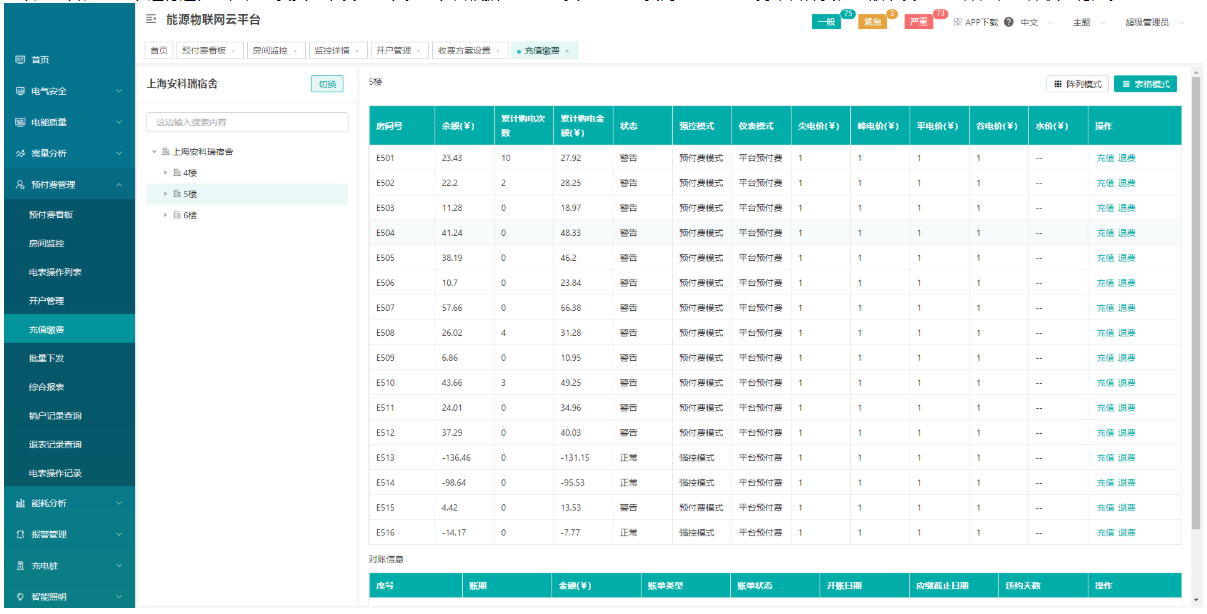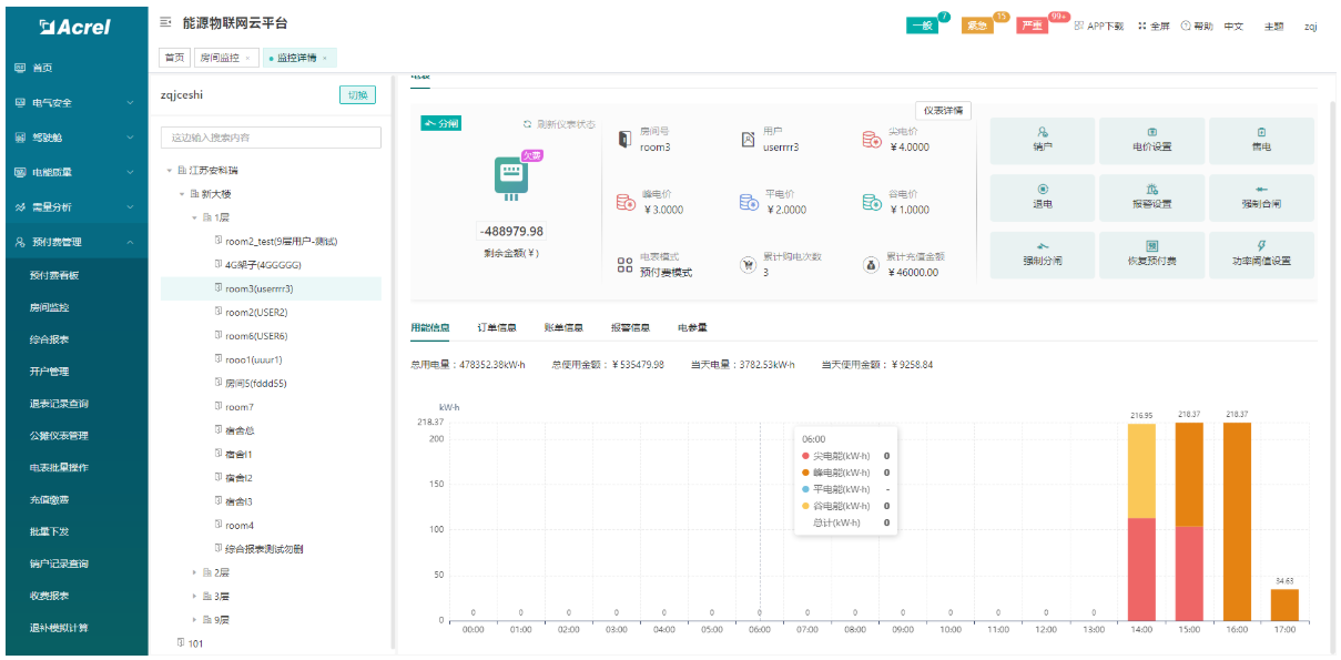清晰简洁的展示所有房间状态信息,所属楼栋楼层,在线失连情况,费用状态等,进入房间详情可对房间当前实时信息进行查看,并可了解当天用电量和使用金额情况,可对房间内的电表进行各种远程控制操作,比如开户、电价设置,售电、退电、报警金额设置、分合闸操作等等。