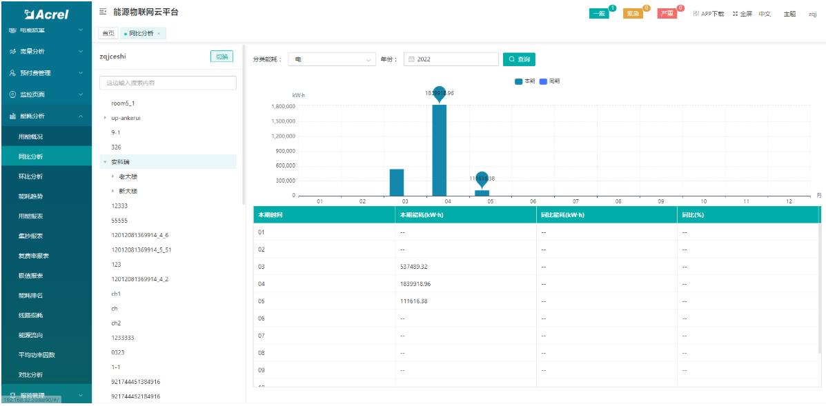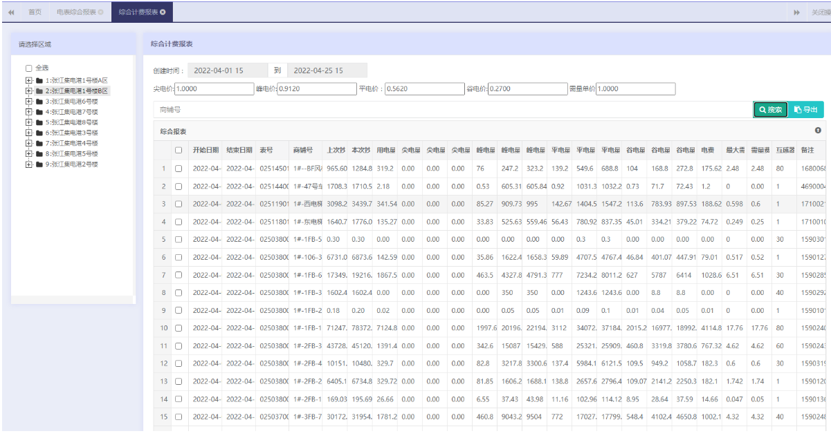 系统还提供了多个报表以供查询。用电综合报表,帮助财务统计每个月商铺总用电量,尖峰平谷用电量以及电费,能耗同比分析,可以比较每个月份与去年同期相比的用能差距。能耗日月年报表,按日,月,年三个不同维度查询电表每个阶段的用能情况。