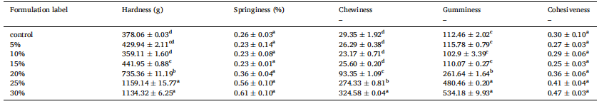 使用质构仪(TA.Xtc-18,上海保圣)和TA/36探头进行测试。测试前速度为3mm /s,测试速度为3mm /s,压缩至初始厚度的50%,测试后速度为3mm /s。检测硬度、弹性、咀嚼性和内聚性,每组样品重复上述测试3次。