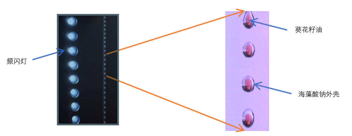 ▲图2. 由葵花籽油核心组成的稳定液滴链包裹在海藻酸盐外壳内
