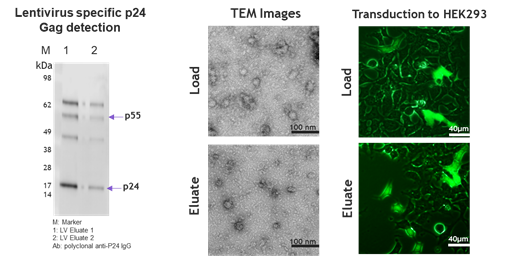 图6.通过WB、电镜和细胞感染实验分别对比了Nereus LentiHERO™纯化前后慢病毒结构蛋白的完整性、颗粒形状大小与感染活力均未受到显著影响。