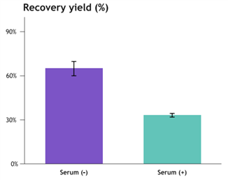 图4.有无血清培养体系慢病毒回收率:纯化后样品中慢病毒/病毒原液%。