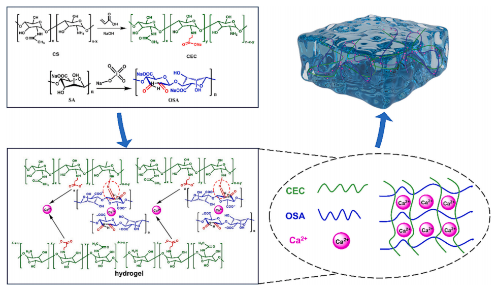 为了解决这些问题,闽南师范大学赖文强副教授团队在《International Journal of Biological Macromolecules》期刊(IF=8.2)上发表了题目为“Double network self-healing hydrogels based on carboxyethyl chitosan/oxidized sodium alginate/Ca2+: Preparation, characterization and application in dye absorption ”的文章(DOI: 10.1016/j.ijbiomac.2024.130564),文章中介绍了壳聚糖羧乙基改性并且和氧化海藻酸钠交联制备自愈水凝胶的方法。同时,Ca2+的加入通过与羧基部分形成配位键,促进了“钙桥”的形成,增强了水凝胶的性质,并且对各种性能进行了综合分析,包括形态属性、热稳定性、膨胀行为、机械特性、流变行为、自愈能力和吸附性能。文章制备了具有高力学性能、优异热稳定性和自愈性能的双网状水凝胶,可将其应用于染料的吸附,为水污染治理提供一种新型的绿色吸附材料。