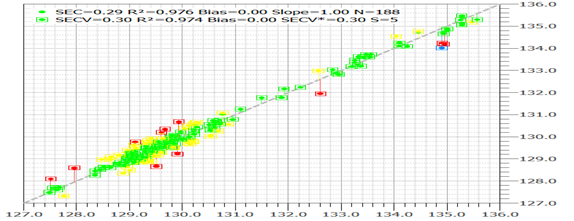 ▲ 碘价的化学值与预测值的相关关系图