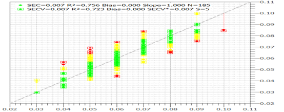 ▲ 酸价的化学值与预测值的相关关系图