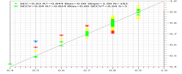 ▲ 色泽的化学值与预测值的相关关系图