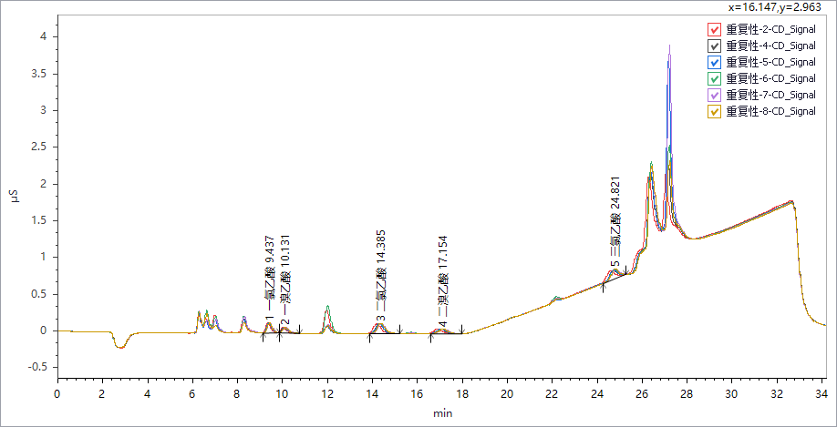标准曲线系列浓度见表1,按照1.1的测试条件进行测试,得到标准曲线谱图多点重叠谱图如图1,五种卤乙酸在该色谱条件下标准曲线线性均大于0.999,线性良好,各离子线性方程如下表2