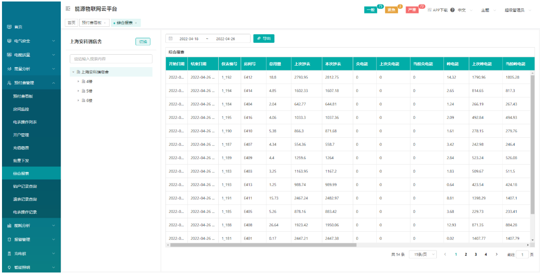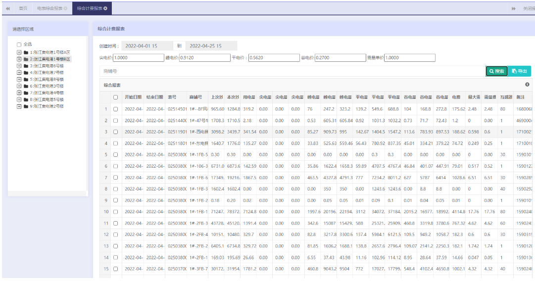 系统还提供了多个报表以供查询。用电综合报表,帮助财务统计每个月商铺总用电量,尖峰平谷用电量以及电费,能耗同比分析,可以比较每个月份与去年同期相比的用能差距。能耗日月年报表,按日,月,年三个不同维度查询电表每个阶段的用能情