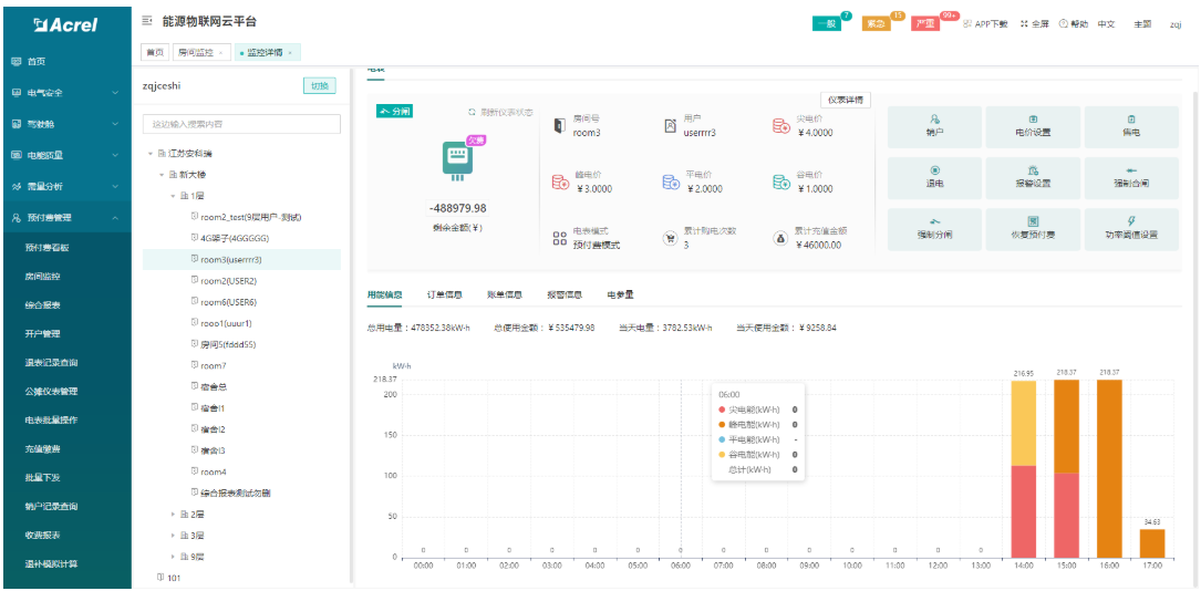 清晰简洁的展示所有房间状态信息,所属楼栋楼层,在线失连情况,费用状态等,进入房间详情可对房间当前实时信息进行查看,并可了解当天用电量和使用金额情况,可对房间内的电表进行各种远程控制操作,比如开户、电价设置,售电、退电、报警金额设置、分合闸操作等等。