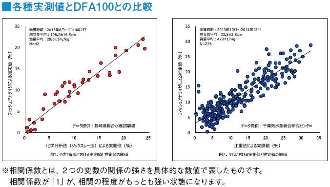 为了确定质量状况,我们使用与索氏提取法和比重法高度相关的Yamato的方法,这些方法是确定鱼的脂肪含量的标准。Fish AnalyzerTM估算的脂肪百分比与使用索氏提取法实际测量的金枪鱼背部脂肪量之间的相关系数为0.95。另外,鲭鱼比重法脂肪含量实测值的相关系数高达0.86。