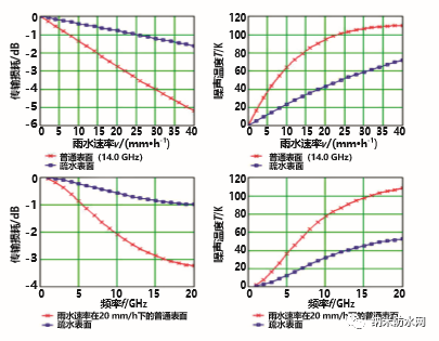 为了直观地了解天线罩表面疏水性的重要性, 图2比较了一个普通天线罩表面与一个疏水天线罩表 面在不同雨量、频率下与传输损耗、噪声温度间的 关系[2]。