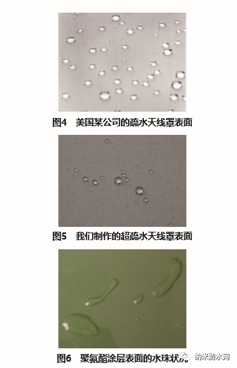 国外很早就研究了天线罩表面疏水性,美国、 日本和英国等国最早将高疏水性涂料涂覆在天线罩 上,得到疏水且耐老化的表面,大大提高了雨天的 电讯可靠性[5]。目前,国外在含氟树脂等高疏水性涂 料的生产和施工方面的技术已相当成熟;国内在雷 达天线罩专用的超疏水性涂层技术方面研究很少, 还未见公开报道。图4是美国某公司的疏水天线罩表 面,图5是我们制备的超疏水天线罩表面,图6是常 规聚氨酯涂层表面的水珠状况。