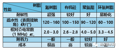 有机硅树脂和有机氟树脂均是疏水性能优异的 材料,但采用单一树脂无法制备出综合性能好的涂 料,必须由两种或两种以上的树脂通过物理或化学 的方法进行改性,目前应用于天线罩表面涂覆的常 用几种树脂性能对比见表1[3,4]。
