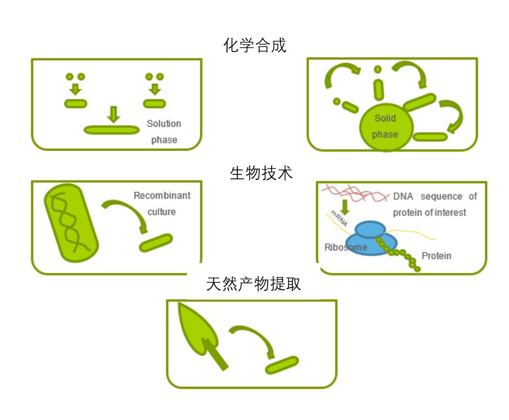 通过化学合成、利用重组微生物或无细胞表达系统进行制造,以及通过从其自然环境中提取,可以实现蛋白质和多肽的制造。适合的制造策略在很大程度上取决于所需分子的大小和化学特性。