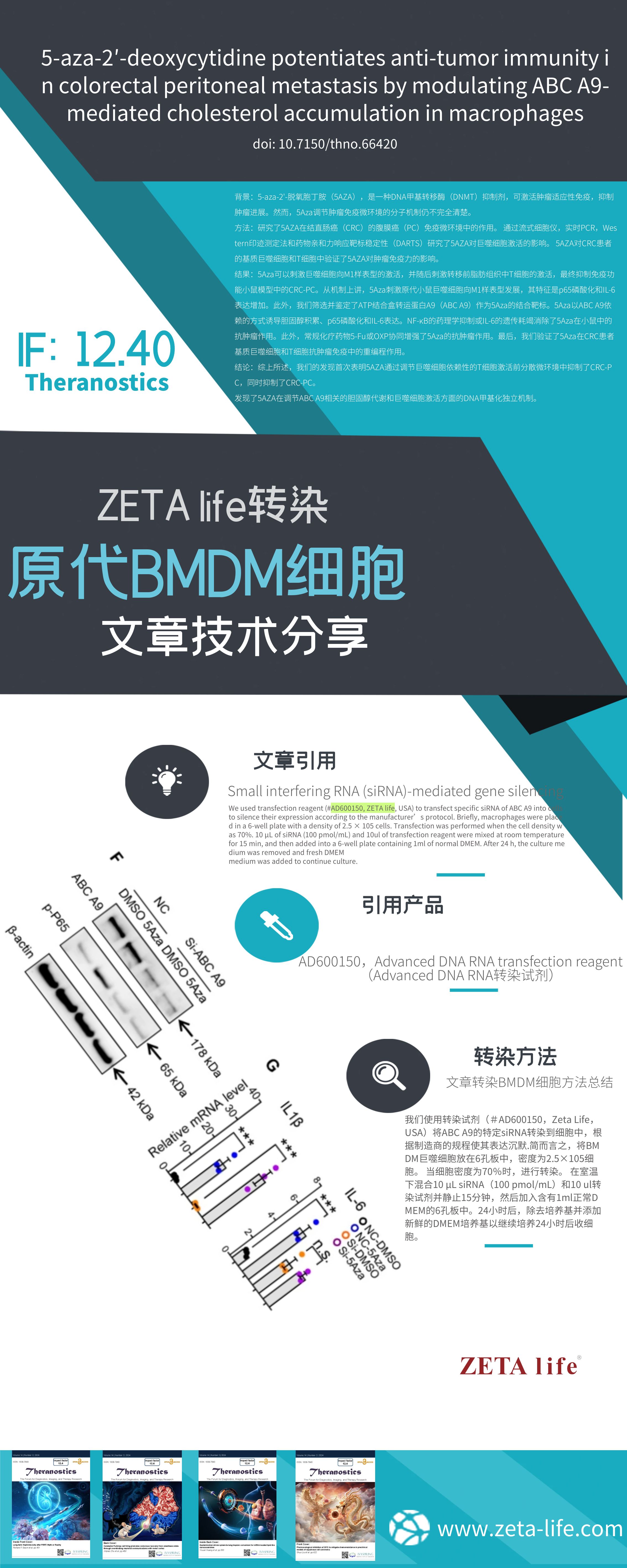 我们使用转染试剂(#AD600150,ZETA life,USA)将ABC A9的特定siRNA转染到细胞中,根据制造商的规程使其表达沉默.简而言之,将BMDM巨噬细胞放在6孔板中,密度为2.5×105细胞。 当细胞密度为70%时,进行转染。 在室温下混合10 µL siRNA(100 pmol/mL)和10 ul转染试剂并静止15分钟,然后加入含有1ml正常DMEM的6孔板中。24小时后,除去培养基并添加新鲜的DMEM培养基以继续培养24小时后收细胞。