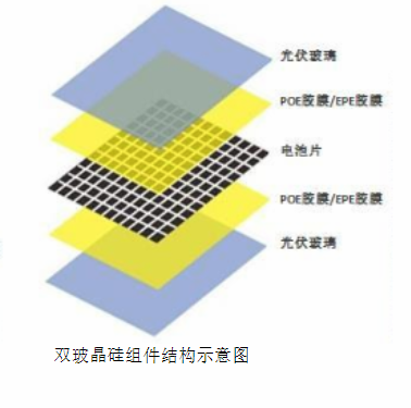 组件最中间依然是电池片,向外一层是POE胶膜/EPE胶膜,最外层都是光伏玻璃,可简单理解为把单面组件的光伏背板替换成光伏玻璃。