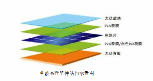 常规的单面组件,一共分为五层,分别为光伏玻璃、EVA胶膜、电池片、EVA胶膜/白色EVA胶膜、光伏背板。其中,光伏背板主要对电池片起保护和支撑作用,并不透光。